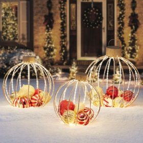 This set of festive decorations makes a stately addition to indoor and outdoor holiday displays with three pre lit jumbo wired ornaments enclosing an assortment of smaller shatterproof ornaments.